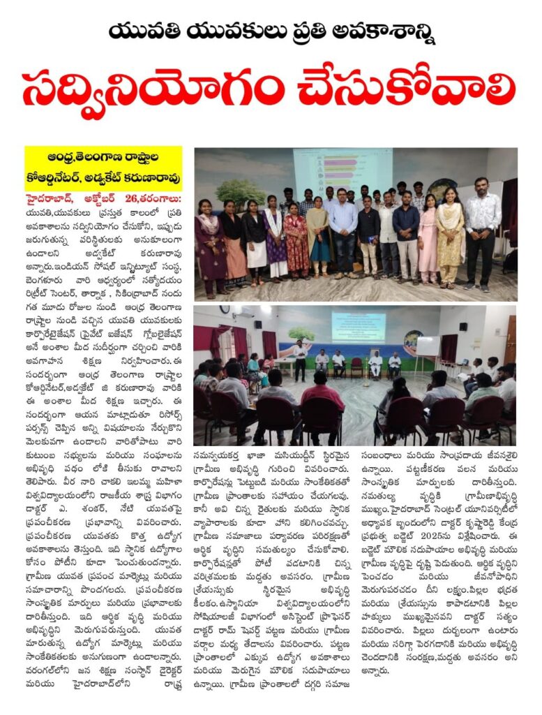 The resource persons, Dr. A. Shankar, Dr. Ram Shepherd, Mr. Khaja Masiuddin and Dr. Krishna Reddy explained the Union Budget 2025 focusing on urban and rural differences and inclusive development. They guided participants to focus on sustainable rural development, environmental protection, and support for small farmers. They felt happy and inspired to see the youth’s curiosity, confidence, and commitment to understanding the Central Government Budget 2025 and its benefits for marginalized communities.