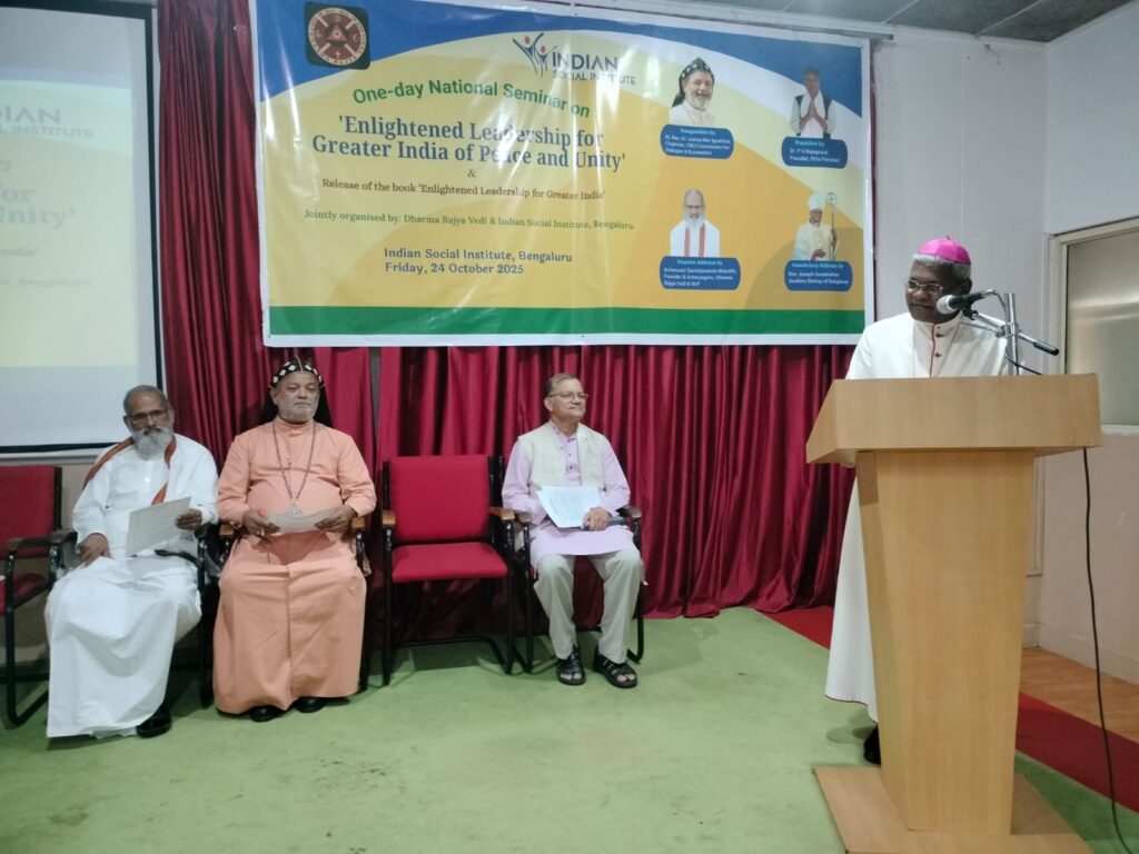 A one-day National Seminar on the theme ‘Enlightened Leadership for a Greater India of Peace & Unity’ was jointly organised by Dharma Rajya Vedi (DRV) and  Indian Social Institute (ISI), Bengaluru on 24th October, 2025.
