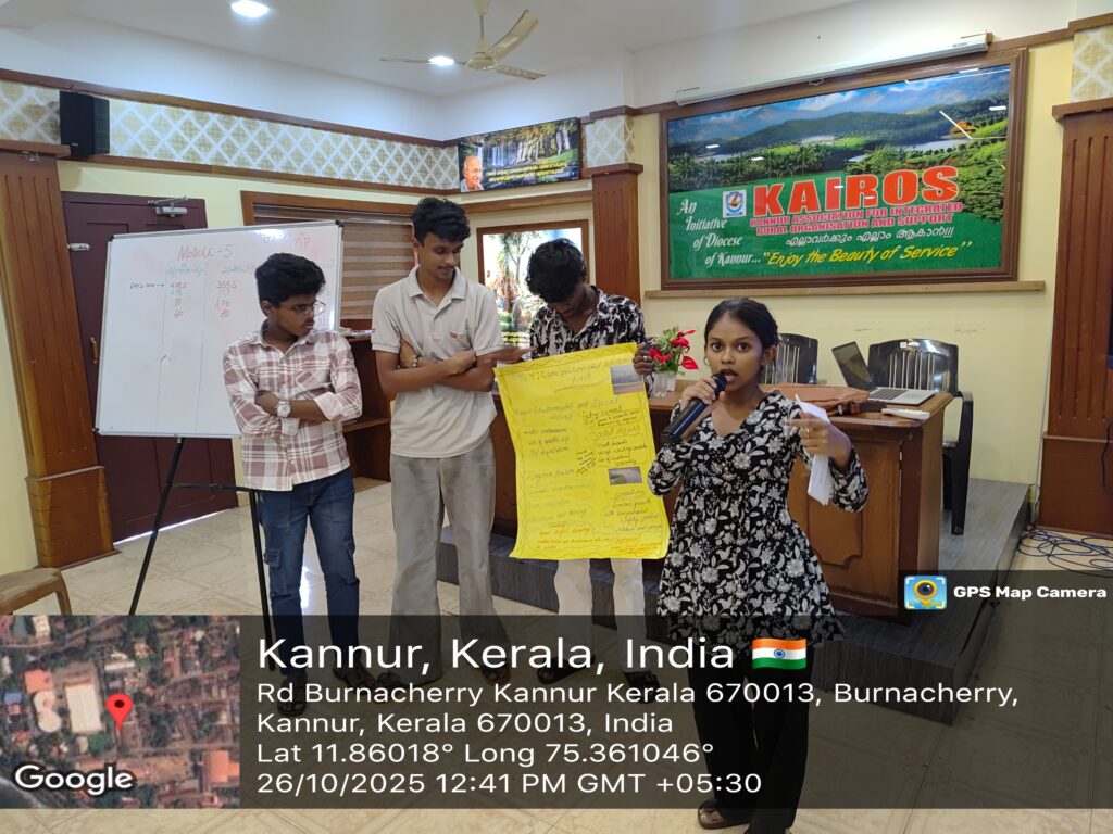 Youth Engagement for Equality and Sustainability Module V – Women and Mother EarthLocation: KAIROS – Kannur, KeralaDates: 24th – 26th October 2025Partner Organisations: KAIROS, Thalassery Social Service Society (TSSS), and DSSSResource Persons: Mr. Mohan and Mr. ManojYouth Participants: 25 (Male – 15, Female – 10) The three-day experiential training on “Women and Mother Earth” provided […]